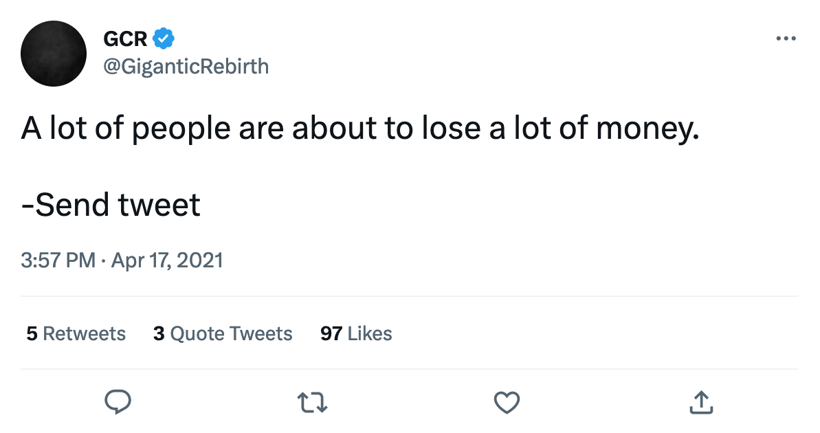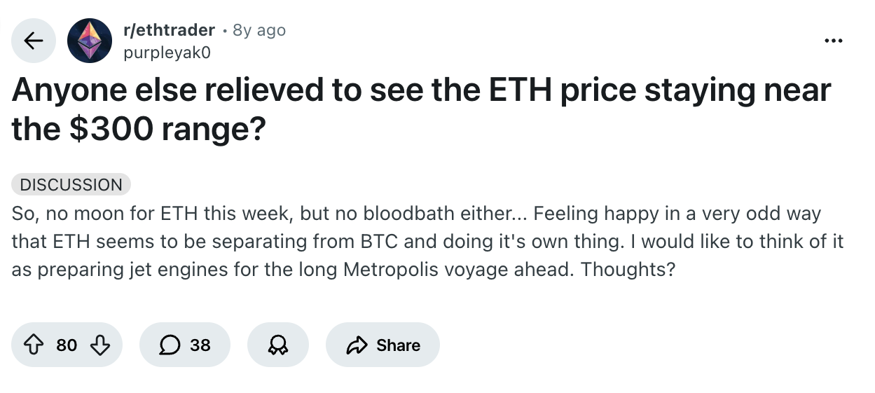 The “smart” guys especially, all missed out. They were too concerned with the clout of being a contrarian instead of just buying Bitcoin. Instead of just buying Ether.