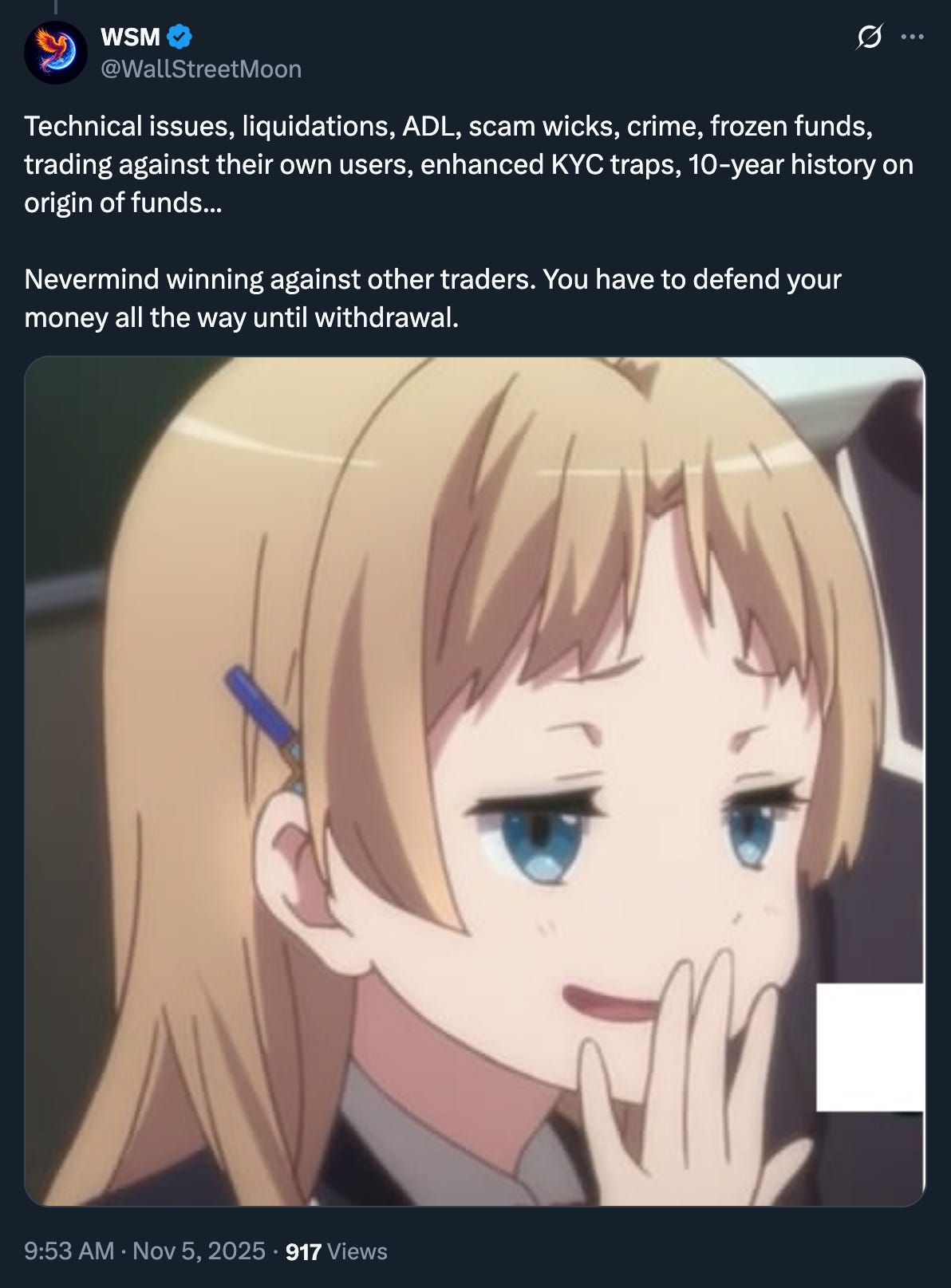 Not if, but when. The crypto market is far too small relative to traditional markets, and you’re competing against crime and insider trading. Most of you trade manually with the emotional control of a toddler. Insanity.