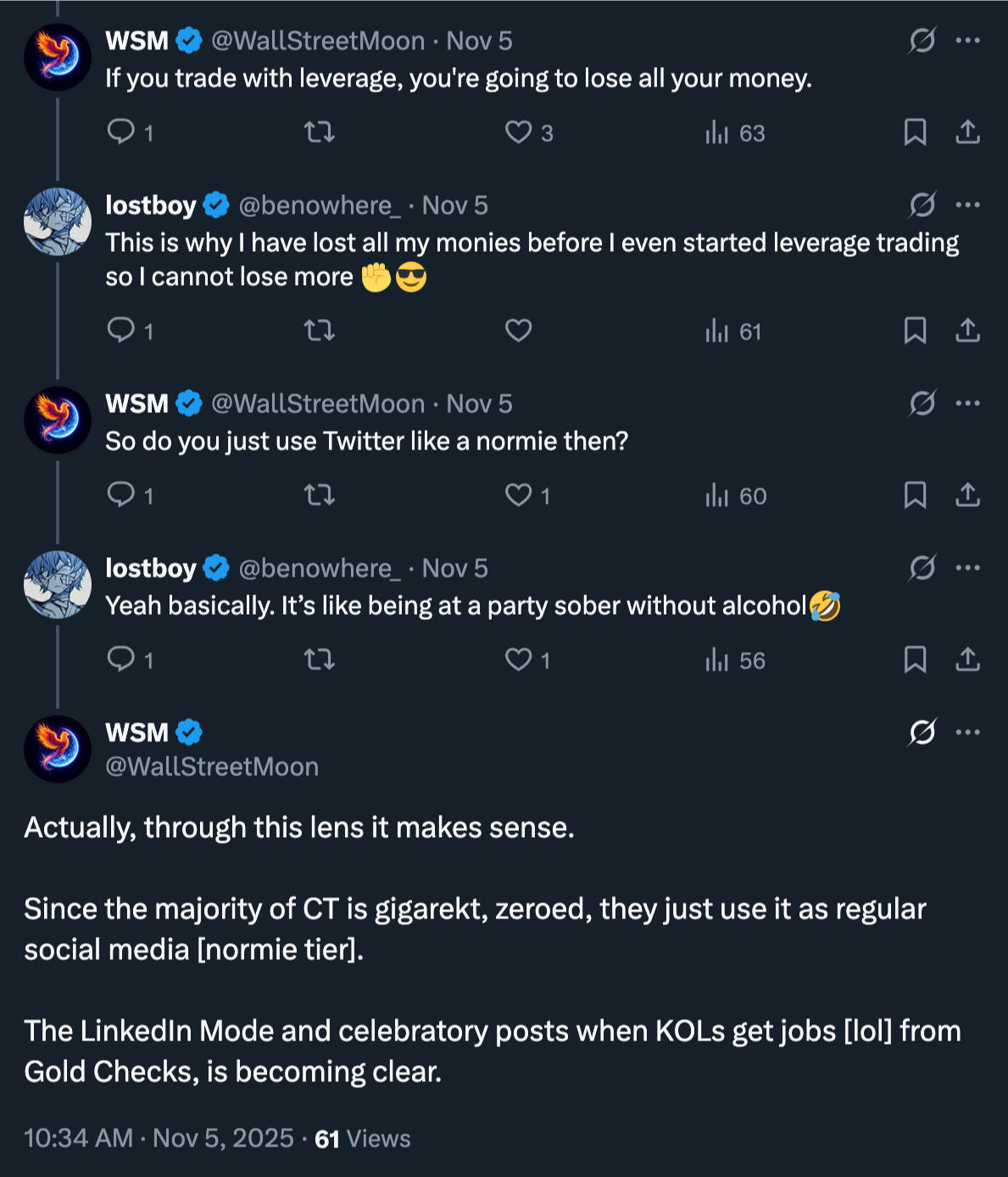You sold your future and fumbled your bag. You’re a washed-up wagie in disguise [KOL] with a paid group. The timeline celebrates when you get a job from a gold checkmark. Also known as Work to Earn.