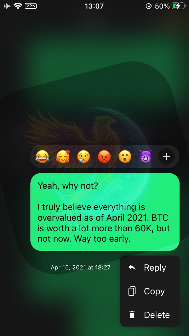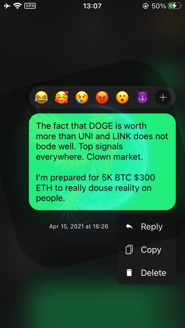 I couldn’t sleep. I had a chub the whole time, eyes glued to my screen watching the prices. At this point it’s been just over 1.5 years that I’ve been waiting. I needed to be awake to ensure I full-ported back into Bitcoin & Ether successfully.