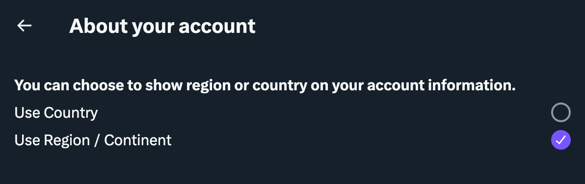 Twitter Settings and Privacy → Privacy and safety → About your account → Use Region/Continent